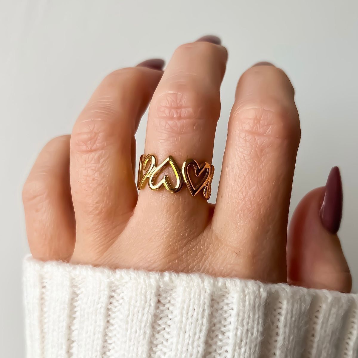 Featuring delicate heart accents along a sleek band, this ring brings a subtle yet meaningful charm to your look. Its minimal design makes it perfect for everyday wear, while the heart detailing adds a gentle, romantic touch that never goes unnoticed.
